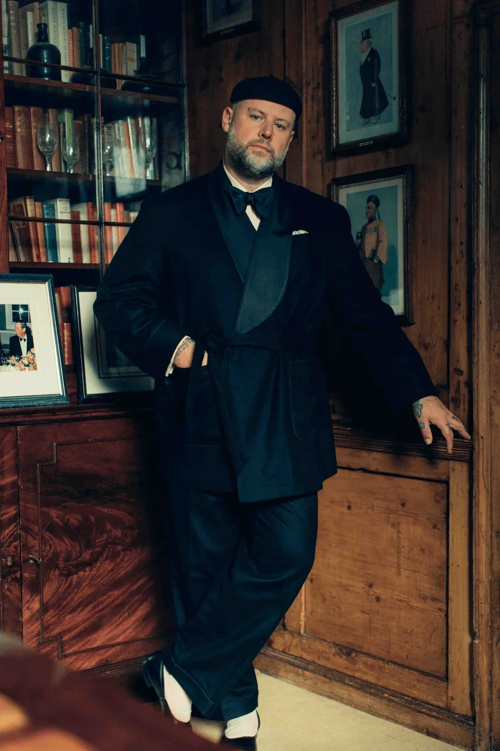 自宅に縛られ、自由に旅もできない状況の中で、それでも「もっと良い日々」を夢見るような服――実用性とエレガンス、シンプルさと華やかさ、リラックスとフォーマル。その両立をどうにかして形にできないかと考えました。当時、私はメンズのホームウェア史を調べて記事を書いていたこともあり、豪奢なローブやパジャマの歴史的写真を、イブニングウェアの精神に重ね合わせる発想に惹かれました。もともとタキシードが「自宅での社交のための簡略化された服装」として生まれたように。